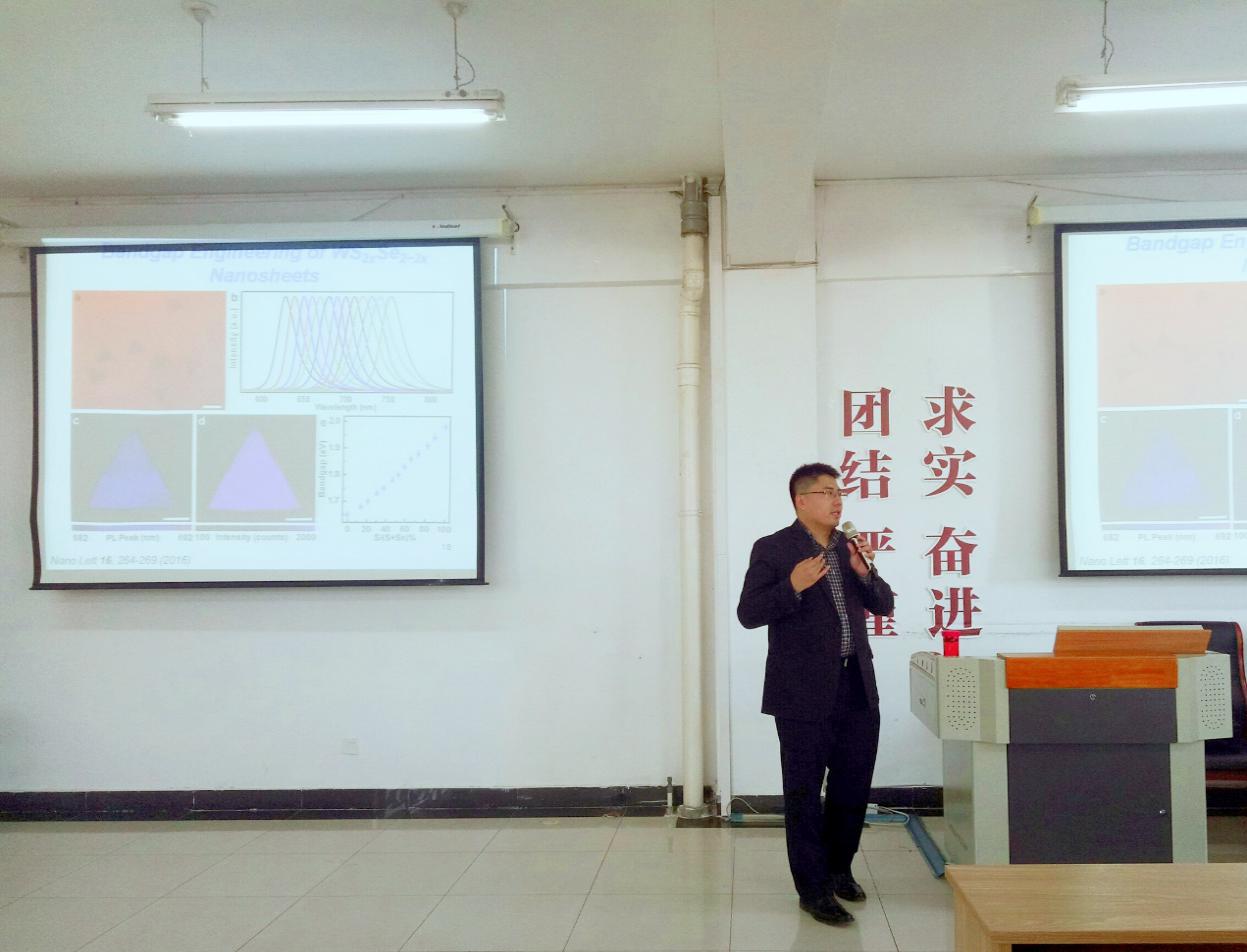 2019年4月26日上午,美国加州大学王琛博士访问我校太阳集团tyc138,并在桃李学术论坛做了题为“van der Waals and Chemical Integration of Nanoscale Materials: from Basic Material Science to Nanoscale Devices Engineering”的专题报告。报告会由褚海斌教授主持,太阳集团tyc138院长张军教授、谷晓俊教授等多位教师与研究生、本科生参加了报告会。王琛博士先是从摩尔定律出发,介绍了半导体器件的发展历史。随后重点介绍了他在基于二维材料,尤其是二维异质材料的半导体器件方面的突破性工作。报告之后,王琛博士又同在座师生进行了交流。