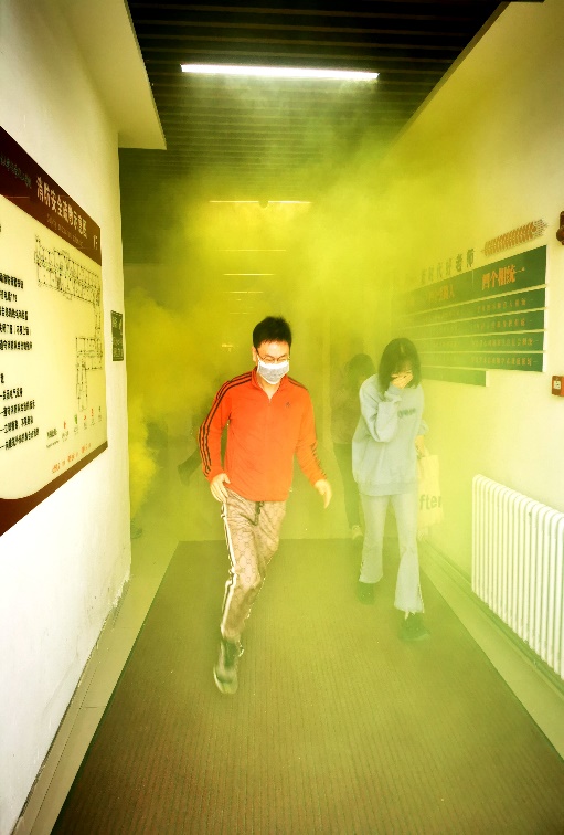 二、实验室突发火灾,烟雾弥漫,要求各实验室人员配带口罩,有条件的用湿毛巾掩盖口鼻,尽快从所属楼层安全通道疏散到实验楼外东侧灭火演练场地。