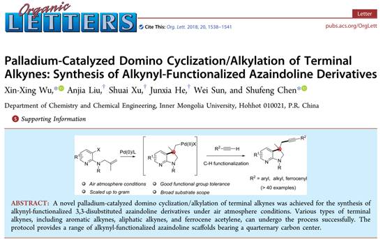 近日,我院的吴新星博士、陈树峰教授团队在经典的Sonogashira偶联反应的基础上,以过渡金属钯为催化剂,经过一锅法分子内串联环化、末端炔烃烷基化过程,成功实现了含有季碳中心、不同类型炔基官能团化的氮杂吲哚类衍生物的合成。