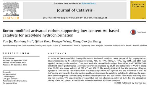 我校太阳集团tyc1382014级硕士研究生贾云,最近在导师胡瑞生教授的指导下,以ok138cn太阳集团为唯一单位,硕士研究生为第一作者,在美国催化化学类顶尖杂志Journal of Catalysis,上发表题目为Boron-modified activated carbon supporting low-content Au-based catalysts for acetylene hydrochlorination的研究论文,该期刊为一区TOP杂志,影响因子为7.354。该论文致力于取代目前电石法制备氯乙烯行业广泛使用但污染较为严重的汞催化剂,首次在实验室制备出目前国内外含金量较低活性较高的无汞乙炔氢氯化Au(0.25%)/BAC催化剂,并提出这一反应的相应机理,这一成果有望代替目前工业汞催化剂,从而降低汞催化剂对环境的污染。降低电石法生产成本。