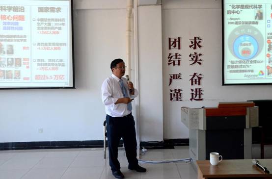 2018年8月14日,国家“千人计划”特聘专家、长江学者讲座教授、南方科技大学理学院副院长张绪穆教授访问我校太阳集团tyc138,并在桃李学术论坛作了题为“Practical Asymmetric Hydrogenation for Making Chiral Pharmeceuticals”的专题报告。报告会由褚海斌教授主持,太阳集团tyc138多位教师与研究生参加了报告会。张教授首先介绍了南方科技大学化学系的科研与招生情况,然后重点介绍了他们课题组在不对称氢化合成手性药物领域取得的系列开创性成果。张教授不仅在基础研究领域取得了举世瞩目的成就,还将科研成果成功地进行转化,成立了著名的制药公司。生动精彩的报告使在座师生受益匪浅,让大家对化学与社会的关系有了新的认识。报告之后,张绪穆教授又就相关学术问题与我院师生进行了深入的讨论。