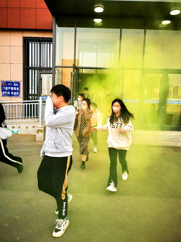 二、实验室突发火灾,烟雾弥漫,要求各实验室人员配带口罩,有条件的用湿毛巾掩盖口鼻,尽快从所属楼层安全通道疏散到实验楼外东侧灭火演练场地。