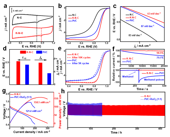 作者以K+/PDA为前驱体,煅烧后得到N原子配位的原子分散K催化剂(K-N-C)。K-N-C催化剂在ORR中表现出良好的催化活性和稳定性。半波电位(E1/2)高达0.908V。10,000次循环后,E1/2的变化可以忽略不计。此外,K-N-C提供了158.1 mW cm-2的卓越功率密度和长达420小时的锌空气电池耐久性。