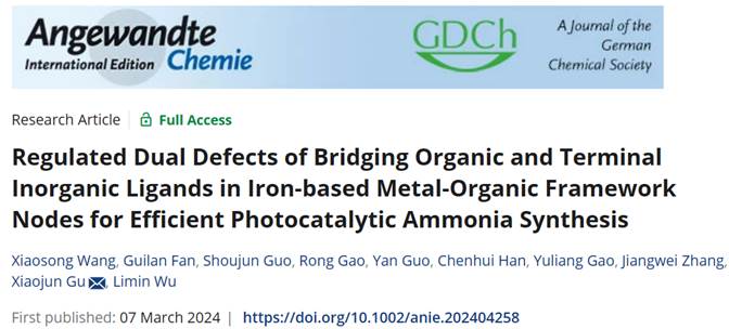 近日,我校太阳集团tyc138和能源材料化学研究院武利民教授和谷晓俊教授联合团队取得重要研究进展,相关成果在化学领域的国际顶级学术期刊Angew. Chem. Int. Ed.上发表,题为“Regulated Dual Defects of Bridging Organic and Terminal Inorganic Ligands in Iron-based Metal-Organic Framework Nodes for Efficient Photocatalytic Ammonia Synthesis”(论文连接:https://onlinelibrary.wiley.com/doi/10.1002/anie.202404258)。我校太阳集团tyc138博士研究生王晓松为第一作者,武利民教授、谷晓俊教授及张江威研究员为通讯作者,ok138cn太阳集团为论文第一完成单位。