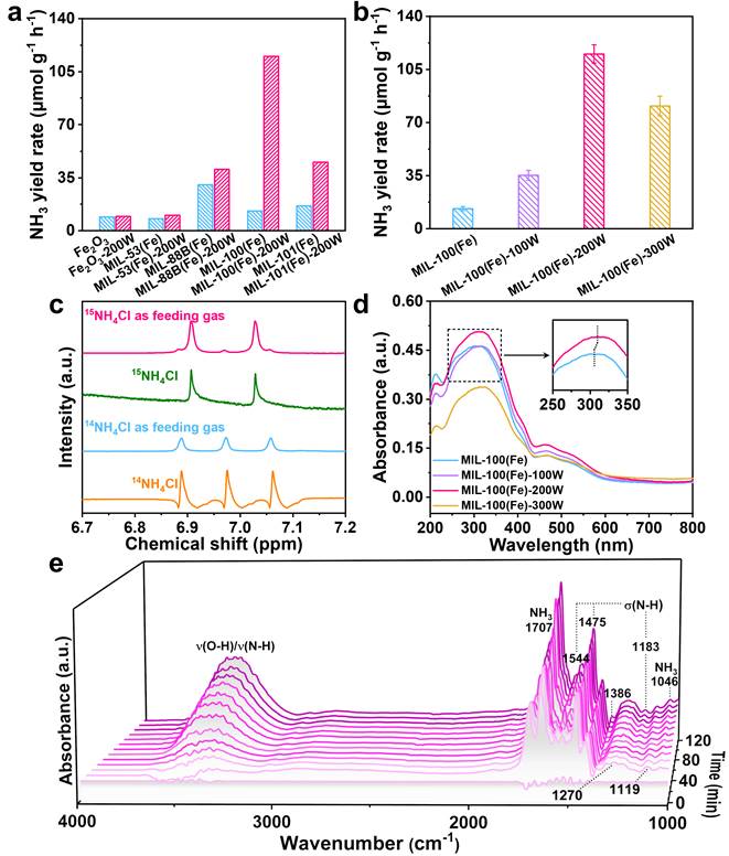 图2. 缺陷型Fe基MOF的光催化固氮性能与原位FTIR光谱表征