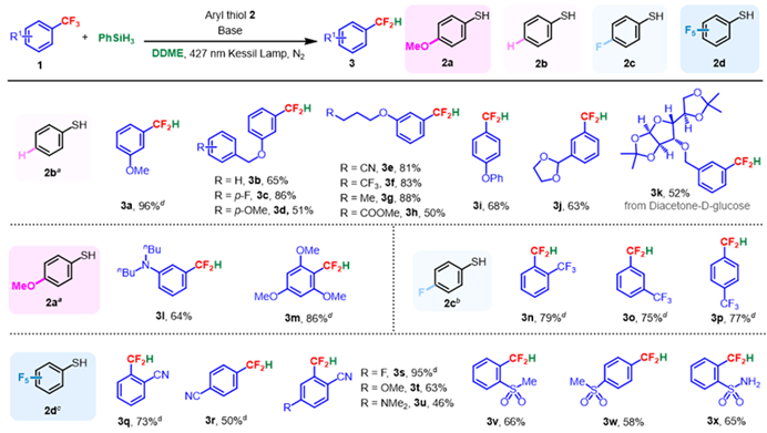 文章通过选择相应不同还原电位的硫醇,以通过光诱导EDA策略实现三氟甲基芳烃的选择性脱氟。反应中,各种给电子和吸电子官能团被很好地兼容。同时,反应具有高度的脱氟选择性,几乎不发生过度脱氟。