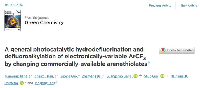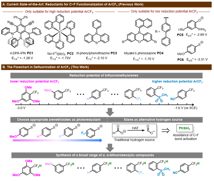 键的脱氟功能化。成功实现了三氟甲基芳烃的脱氟质子化、脱氟氢化烷基化、脱氟烷基磺酰化及脱氟烷基硫化反应。相关工作近期作为封面文章连续在国际著名化学期刊