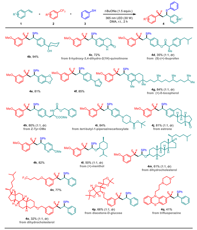 反应结果证明了该反应较好的化学选择性,第一次脱氟加氢后C-F键的过度还原被抑制。反应具有宽泛的底物适用范围和良好的官能团耐受性。文章进一步尝试将该方案应用于ArCF3的脱氟烷基化。几种生物活性骨架以中等产率引入ArCF3中,包括Cinacacet、衍生葡萄糖和三氟哌嗪。同时测试了相关的烯烃,如(±)-布洛芬、萘普生、丁香酚、β-蒎烯、(+)-薄荷醇和(+)-cedrol等衍生烯烃均可较好耐受。