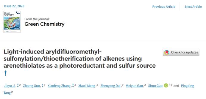 “A General Photocatalytic Hydrodefluorination and Defluoroalkylation of Electronically-Variable ArCF3 by Changing Commercially-Available Arenethiolates” “Light-induced Aryldifluoromethyl-Sulfonylation/thioetherification of Alkenes using Arenethiolates as a Photoreductantand Sulfur Source”