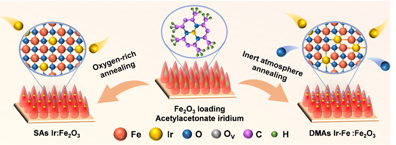 图示 1. SAs Ir:Fe2O3和 DMAs Ir-Fe:Fe2O3的合成示意图。