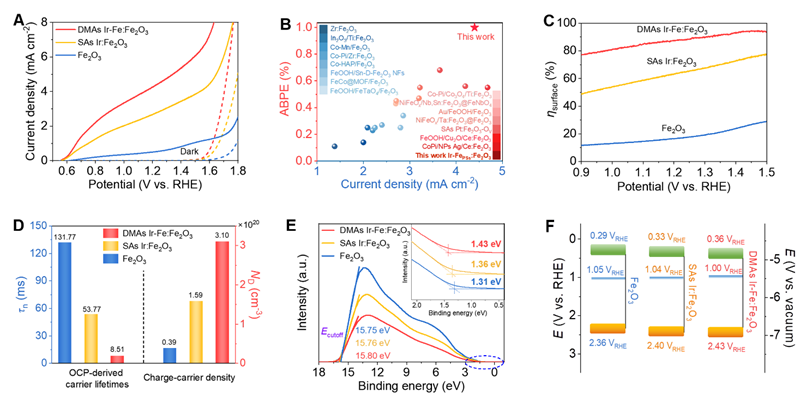 图 4. Fe2O3、SAs Ir:Fe2O3和DMAs Ir-Fe:Fe2O3的PEC性能。
