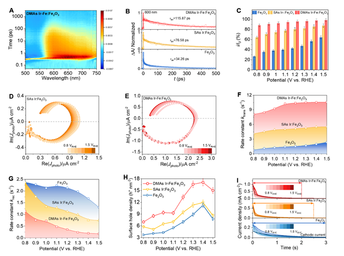 图 5. Fe2O3、SAs Ir:Fe2O3和DMAs Ir-Fe:Fe2O3的光生电荷载流子动力学分析。