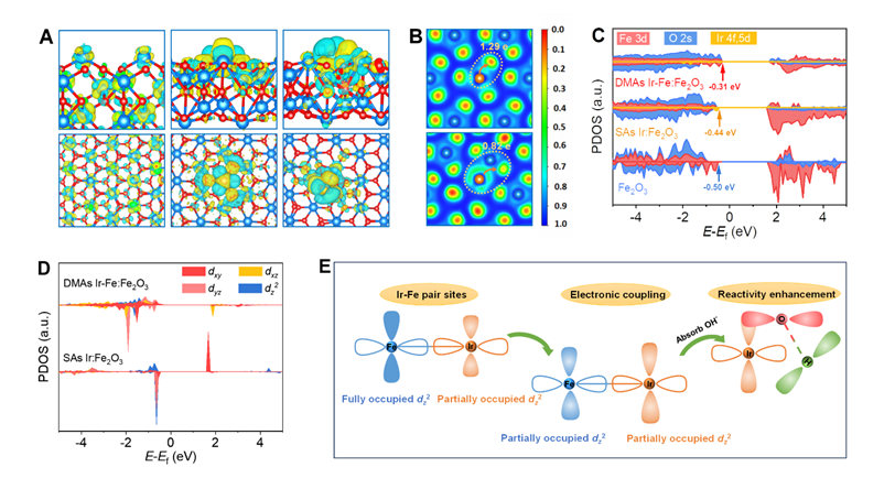图 3. SAs Ir:Fe2O3和 DMAs Ir-Fe:Fe2O3的电子结构。