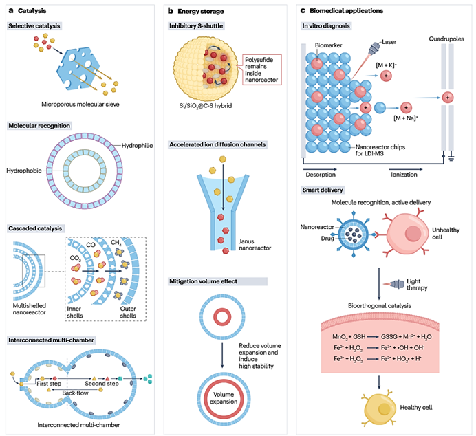 化学成分可调的纳米反应器在空间划分、功能和微观结构等方面具有天然细胞的特性,并且多孔纳米反应器具有明确的孔结构和空间分离的活性位点,能够促进分子的传质、富集和大小筛选,在催化、储能和生物医学等领域具有重要意义。在催化过程中,多孔硅碳纳米反应器提供了高效的传质通道和多功能组分,确保多步反应的时空耦合。在储能领域,具有不同活性成分(例如碳和金属氧化物)的中空多壳结构有望减缓离子穿梭效应,并缓解充放电循环过程中的体积膨胀问题。在生物医学应用中,这类反应器通过可调节的孔隙大小为蛋白质、酶或药物的装载提供了灵活的空腔结构。