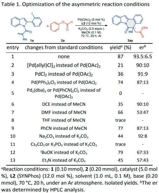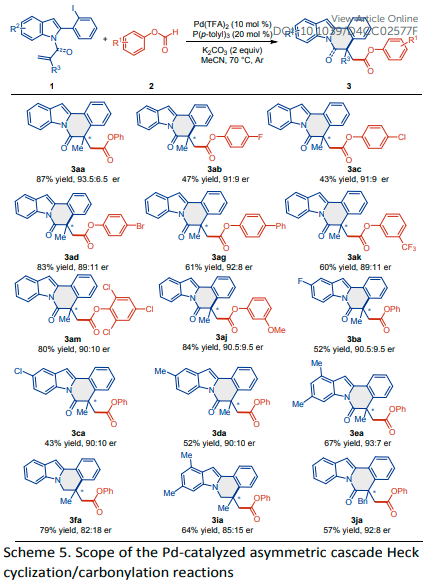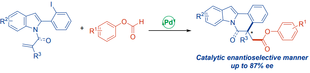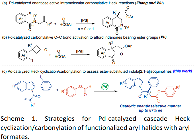 另一方面,钯催化的羰基化策略已被证明是合成羰基化合物的一种强有力的方法。由于一氧化碳(CO)的毒性,已经开发了许多CO替代物,如TFBen、 Mo(CO)6、甲酸酯、和甲酸。沿着这一思路,使用甲酸酯作为羰基来源的钯催化级联羰基化取得了相当大的进展。例如,Zhang课题组开发了一种以甲酸芳基酯为羰基源的Pd催化的对映选择性分子内羰基化Heck反应,得到了一系列产率高、对映选择性高的3,4-二氢异喹啉季铵盐(Scheme 1a)(Chem. Sci. 2019, 10, 9853-9858)。随后,Wu课题组报道了氨基吡啶与酯组装官能化氮杂吲哚衍生物的Pd催化级联Heck环化/羰基化反应(Scheme 1a)(Chem. Commun. 2022, 58, 6825-6828)。2021年,Xu团队实现了含环丁酮的芳基碘化物与甲酸芳基酯的Pd催化羰基化C-C键活化,提供一系列带有酯基的茚酮(Scheme 1b)(Org. Chem. Front. 2021, 8, 3398-3403)。鉴于吲哚并[2,1-a]异喹啉及酯类衍生物的重要药理学特征,将有价值的酯基掺入吲哚并[2,1-a]异喹啉部分将是非常理想的,并可能为发现新的具有生物活性的潜在药物提供机会。随着作者对合成含氮杂环的持续兴趣(Chem. Commun. 2012, 48, 8012-8014),基于此,ok138cn太阳集团陈树峰、王乐明团队报告了使用甲酸芳基酯作为CO源的吲哚Pd催化级联分子内Heck环化/羰基化反应,以提供一系列酯取代的吲哚并[2,1-a]异喹啉(Scheme 1c)。此外,通过使用手性膦配体也实现了不对称版本,从而以良好的产率和对映选择性得到吲哚并[2,1-a]异喹啉产物。
