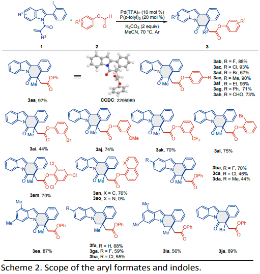 基于上述实验结果和文献中的报道,作者提出了可能反应机理。反应开始于钯(II)与膦配体反应生成活性的钯(0)复合物。钯(0)复合物与碘代吲哚发生氧化加成反应,形成芳基钯(II)中间体A。中间体A通过分子内Heck环化反应生成烷基钯(II)物种B。在碱存在下,由芳基甲酸酯释放的CO发生迁移插入,将中间体B转化为酰基钯(II)物种C。酚作为亲核试剂攻击中间体C,生成预期的产物3aa,并通过随后的还原消除再生活性钯(0)络合物。