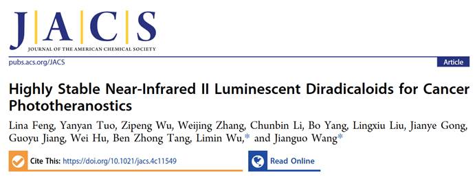 近日,我校太阳集团tyc138王建国教授和能源材料化学研究院武利民教授联合团队在国际顶级期刊Journal of the American Chemical Society上发表题为“Highly Stable Near-Infrared II Luminescent Diradicaloids for Cancer Phototheranostics”(论文链接:https://pubs.acs.org/doi/10.1021/jacs.4c11549)的重要研究成果。该团队首次构建了一种具有高稳定的近红外II区发光有机双自由基材料并用于癌症光诊疗领域。我校太阳集团tyc138博士后冯丽娜为本论文第一作者,武利民教授和王建国教授为共同通讯作者。