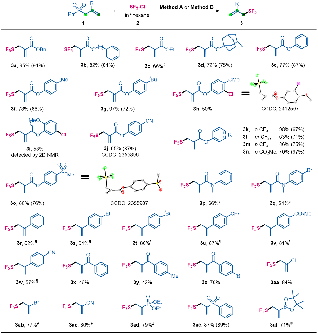 作者通过对离去基团的调控,在确定了最优条件后,对反应底物的普适性进行广泛探究。对于各类酯基、酰胺、芳基、卤素和硼酸酯取代的底物,均以良好的收率获得目标产物。作者还对多数底物在太阳光照射下进行了探究,研究表明均能以良好的收率获得相应的五氟硫基烯丙基化合物。
