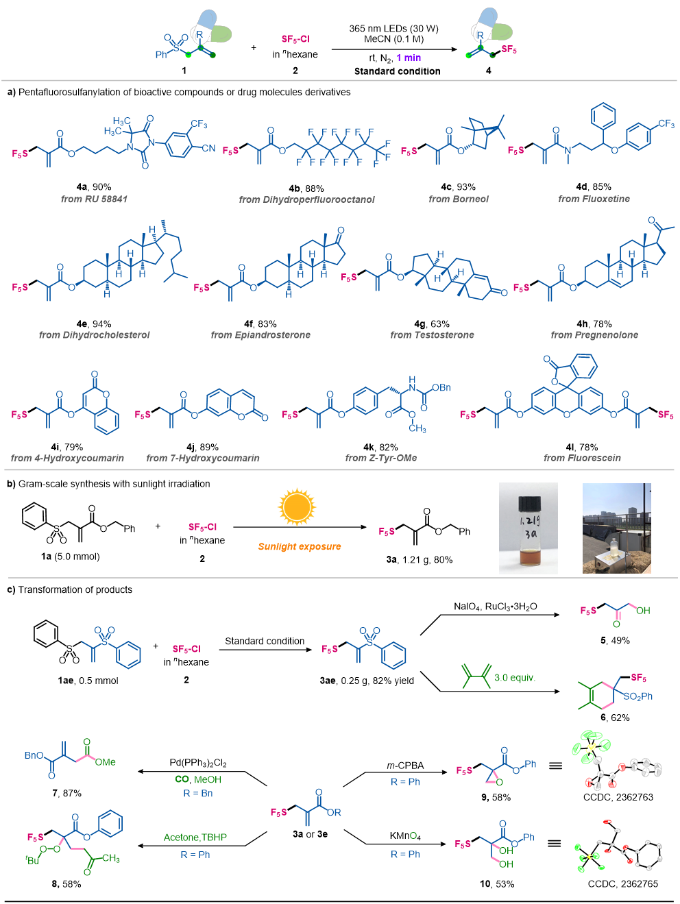 此外,该合成策略还适用于多种药物活性分子的后期官能团化修饰,证明其在复杂分子后期官能化中的价值。为了进一步验证该反应的潜在应用价值,作者在太阳光下进行了放大实验。将该反应放大至5mmol,以1.21克的收率获得目标产物。此外,作者对部分产物进行了一系列合成转化,制备了多种高附加值的复杂结构的化合物。其中,苯磺酰基取代的五氟硫基烯丙基产物3a、3e、3ae的不饱和键在氧化和Diels-Alder反应中表现出良好的反应性,获得含环氧、过氧、双羟基、羟基酮类五氟硫基化合物。