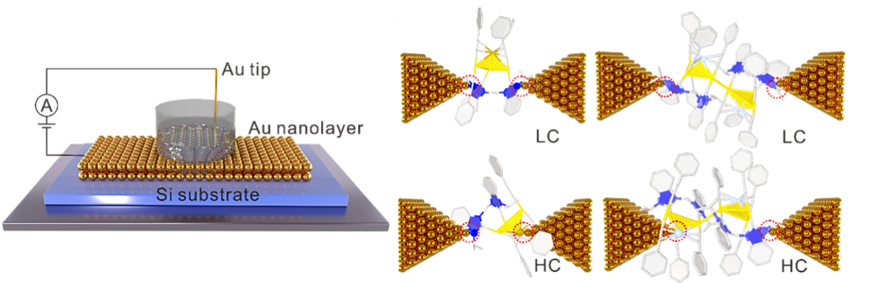原子级精确的配体保护金属纳米团簇,因其明确组成、单分散性、精确结构和离散电子态,成为连接分子化学与纳米材料的重要桥梁。这类体系尤其适用于构筑单分子电子学模型体系,可在单团簇尺度上揭示电荷传输与结构之间的内在关联,同时在催化与能源转化等领域展现出重要应用潜力。氮杂环卡宾(NHC)配体能够显著提升团簇稳定性并赋予其可调控功能,但当前研究仍主要集中于配体调控,通过单原子层级调控电子结构及单团簇电子输运行为的研究仍十分有限,尤其在合金纳米团簇体系中尚缺乏系统认识。基于此他们用STM-BJ技术开展单团簇结电导测量,发现二聚体(Au3Ag)2的单团簇电导较Au3Cu提升达30倍,表明单原子替换可显著调控分子尺度的电子传输行为。有趣的是, (Au3Ag)2在二氧化碳还原反应中的活性较Au3Cu提升约2.3倍,这种电导增强与其电催化性能呈现出直接关联。上述结果表明,单分子电子学既是解析电子结构的重要手段,也是连接结构调控与催化性能的技术桥梁。
