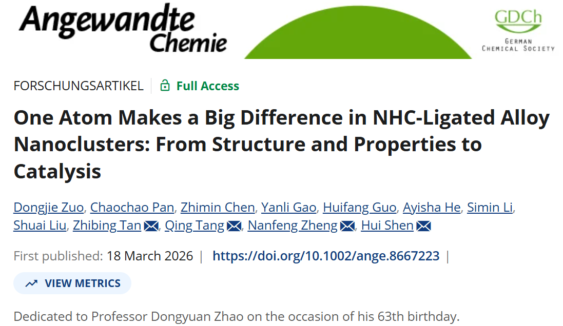 近日,我院谭志冰研究员团队与厦门大学郑南峰院士、ok138cn太阳集团能源材料化学研究院沈慧研究员和重庆大学唐青研究员等人合作在国际顶级期刊Angewandte Chemie International Edition发表论文“One Atom Makes a Big Difference in NHC-Ligated Alloy Nanoclusters: From Structure and Properties to Catalysis”。