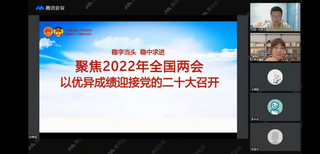 宋青瑶博士从四个方面带领我们学习两会精神:2022年全国两会议程、习近平总书记参加内蒙古代表团审议时的讲话精神、2022年政府工作报告主要内容以及对2022年全国两会十大热点话题讲解。宋青瑶博士强调要铸牢中华民族共同体意识,牢记总书记“稳扎稳打,步履坚实”的教诲。