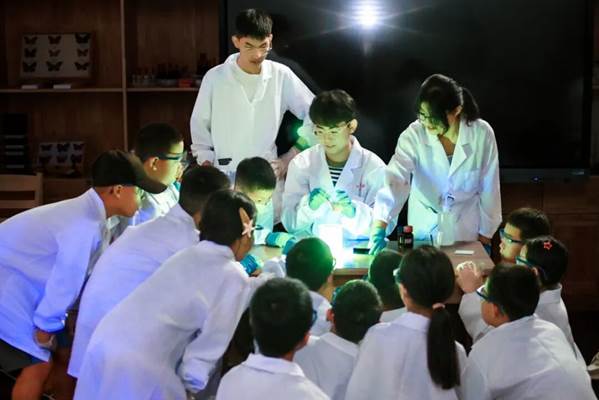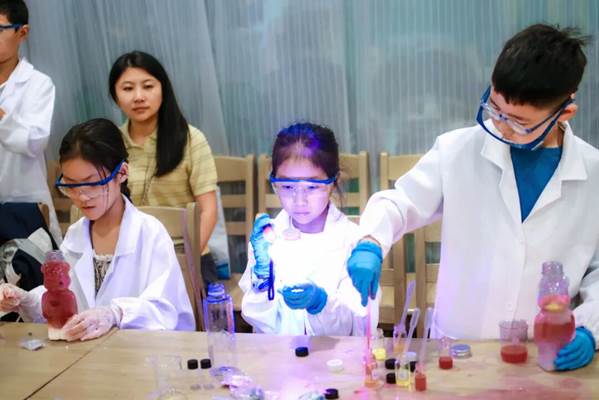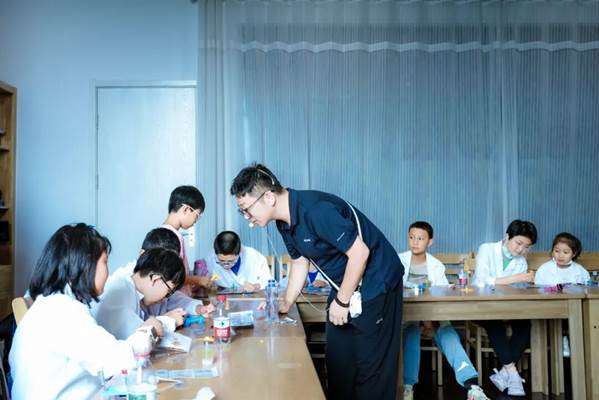荧光实验部分展示了我院在材料化学方面的科普应用。教师通过ACQ效应及“笼效应”等概念,启发学生理解分子结构与发光性能之间的关系,并指导大家制作出在紫外光下发出荧光的海洋瓶,使抽象的理论化为可触摸、可创造的科学作品。