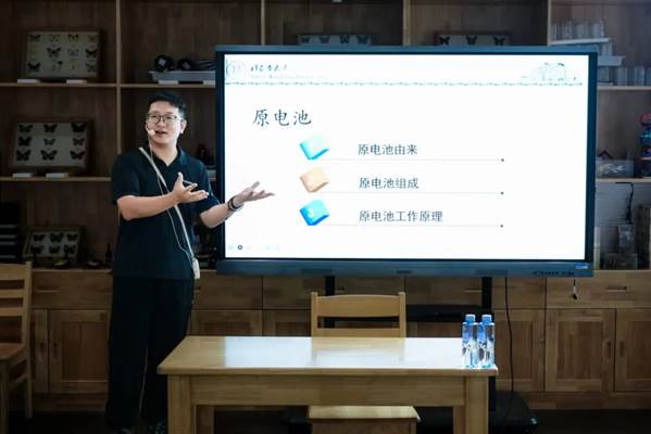 “电池诞生记”实验从电化学基础出发,由我院教师讲解水果电池工作机制,指导学生利用日常水果和金属电极成功点亮灯泡并驱动小型电器,真实再现了化学能向电能的转化过程。