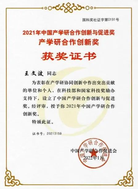 近日,中国产学研合作促进会公布了“2021年中国产学研合作创新与促进奖”评选结果,我院王文波教授荣获中国产学研合作创新奖(个人)。