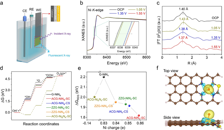 原位X射线吸收光谱研究发现,单原子催化剂中Ni的吸收边随施加电压的变化而改变(图4),表明作为动态催化活性中心的单原子Ni位点具有电位驱动的动力学行为。DFT计算结果表明,虽然S原子不与Ni配位,但S掺杂能够降低催化反应决速步骤的能垒; Ni与水中的O存在强电子相互作用,利于Ni位点强化对反应中间体的吸附,进而促进OER高效进行。