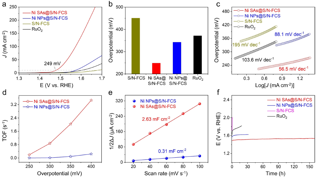 受益于表面暴露的大量单Ni位点和S/N共掺杂的中空结构,催化剂Ni SAs@S/N-FCS表现出优异的OER性能(图3),在10 mA×cm-2时具有249 mV的电位,Tafel 斜率为56.5 mV×dec-1,稳定性长达166小时并且没有性能衰减。