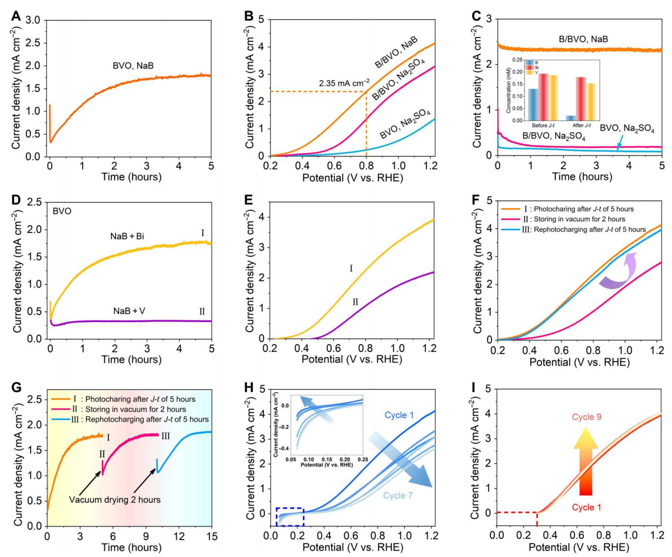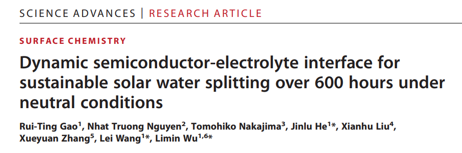 实现中性pH、温和环境下高效、稳定的光电催化(PEC)分解制氢被认为是最有希望的生产清洁可再生能源的途径之一。但中性电解质中由于较低的OH-浓度,表界面反应动力学相比于碱性电解质更加缓慢。BiVO4作为一种新型的PEC半导体材料之一正受到人们的广泛注意,但严重的光生载流子复合和光腐蚀限制了其PEC性能和稳定性。为此,我校太阳集团tyc138和能源材料化学研究院武利民教授和王蕾教授课题组,和贺进禄研究员课题组通过调控电解质组成,原位组装超薄助催化剂,控制半导体/助催化剂界面处的动态平衡,实现在无牺牲试剂下半导体高达600小时的长期耐久性。相关工作于1月4日在线发表在Science子刊Science Advances上。