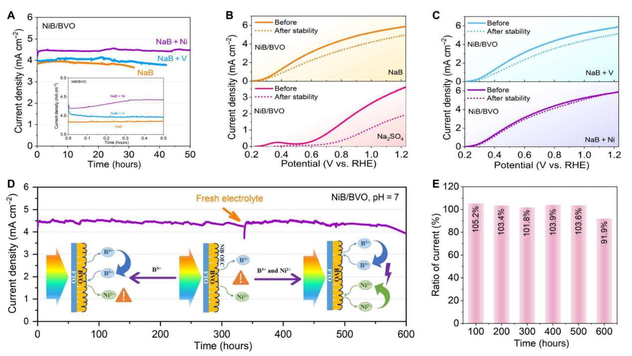 团队首次通过实验证明了B原子原位取代BiVO4中V元素(图1),进一步引入Ni离子,促进B-O键的形成,提高析氧性能,获得的硼酸盐物种可以通过加速质子耦合电子转移而作为催化剂活性的促进剂(图2)。原位组装的NiB催化剂负载于BiVO4在模拟太阳光及1.23 VRHE电位下,获得6 mA cm-2的光电催化性能。更为重要的是,该NiB/BiVO4半导体达到接近600小时的光电催化抗腐蚀性能(图3),是BiVO4基光阳极在中性电解质中最好的稳定性能。IMPS、TAS动力学表征(图4)及非绝热分子动力学与时域密度泛函理论计算(图5)等证明了NiB助催化剂的负载加速了半导体光生载流子的分离与转移,缓解了半导体界面处的载流子复合,揭示半导体光生载流子寿命的延长机理。该研究可以有效推动PEC水氧化半导体/电解质动态界面的前沿发展。