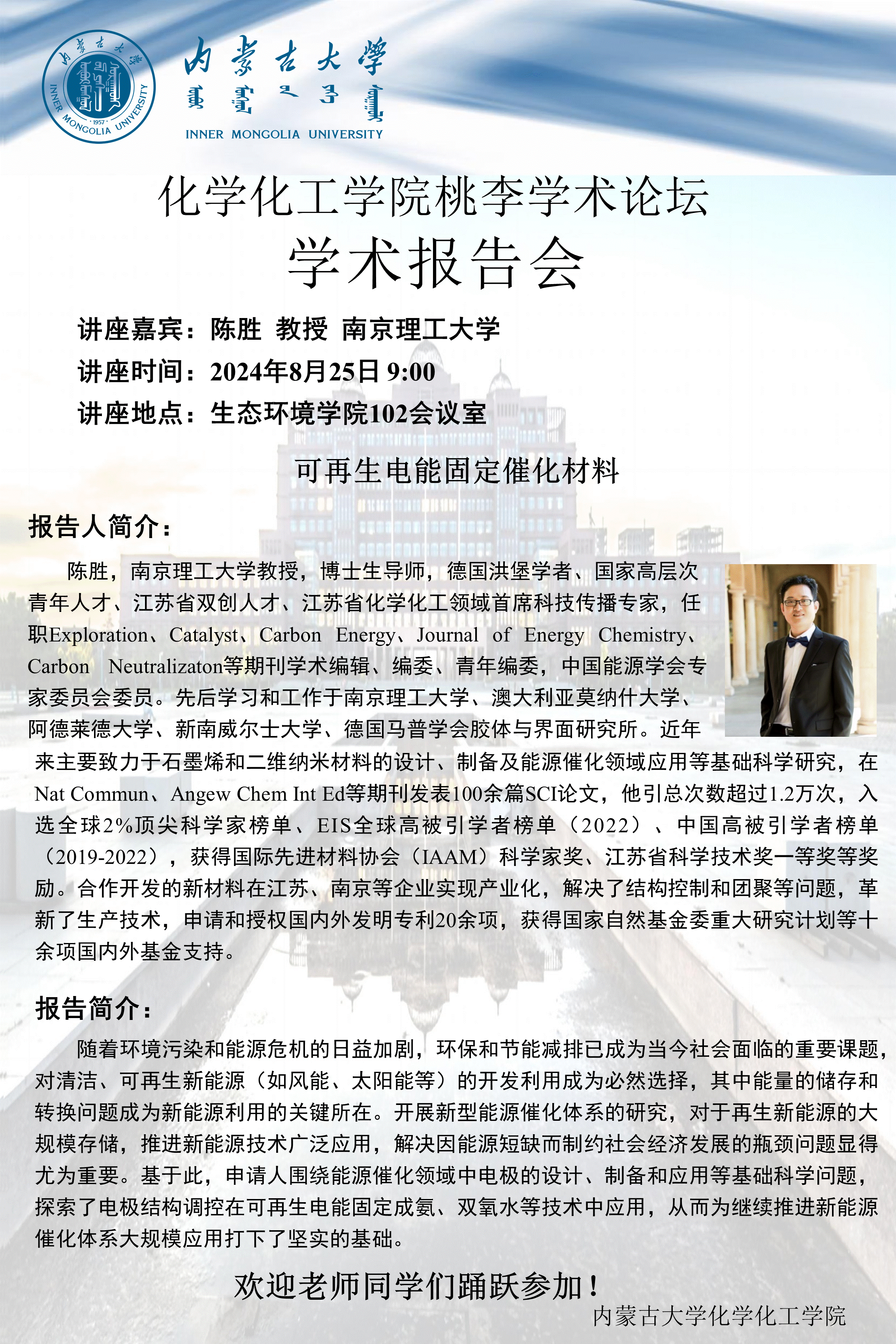 太阳集团tyc138桃李学术论坛——可再生电能固定催化材料 陈胜 教授 南京理工大学