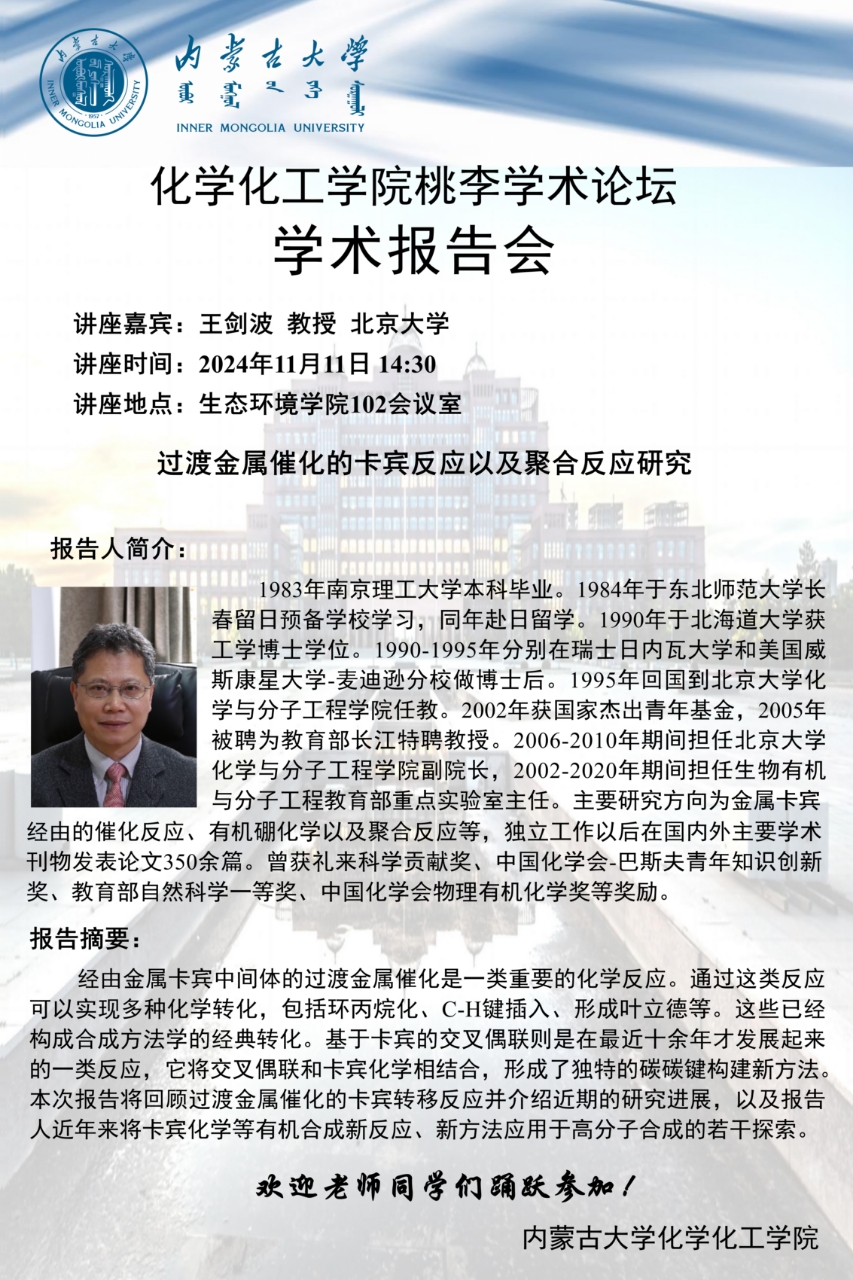 太阳集团tyc138桃李学术论坛——过渡金属催化的卡宾反应以及聚合反应研究 王剑波 教授 北京大学