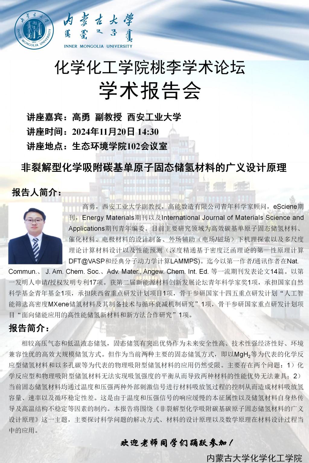 太阳集团tyc138桃李学术论坛——非裂解型化学吸附碳基单原子固态储氢材料的广义设计原理 高勇 副教授 西安工业大学