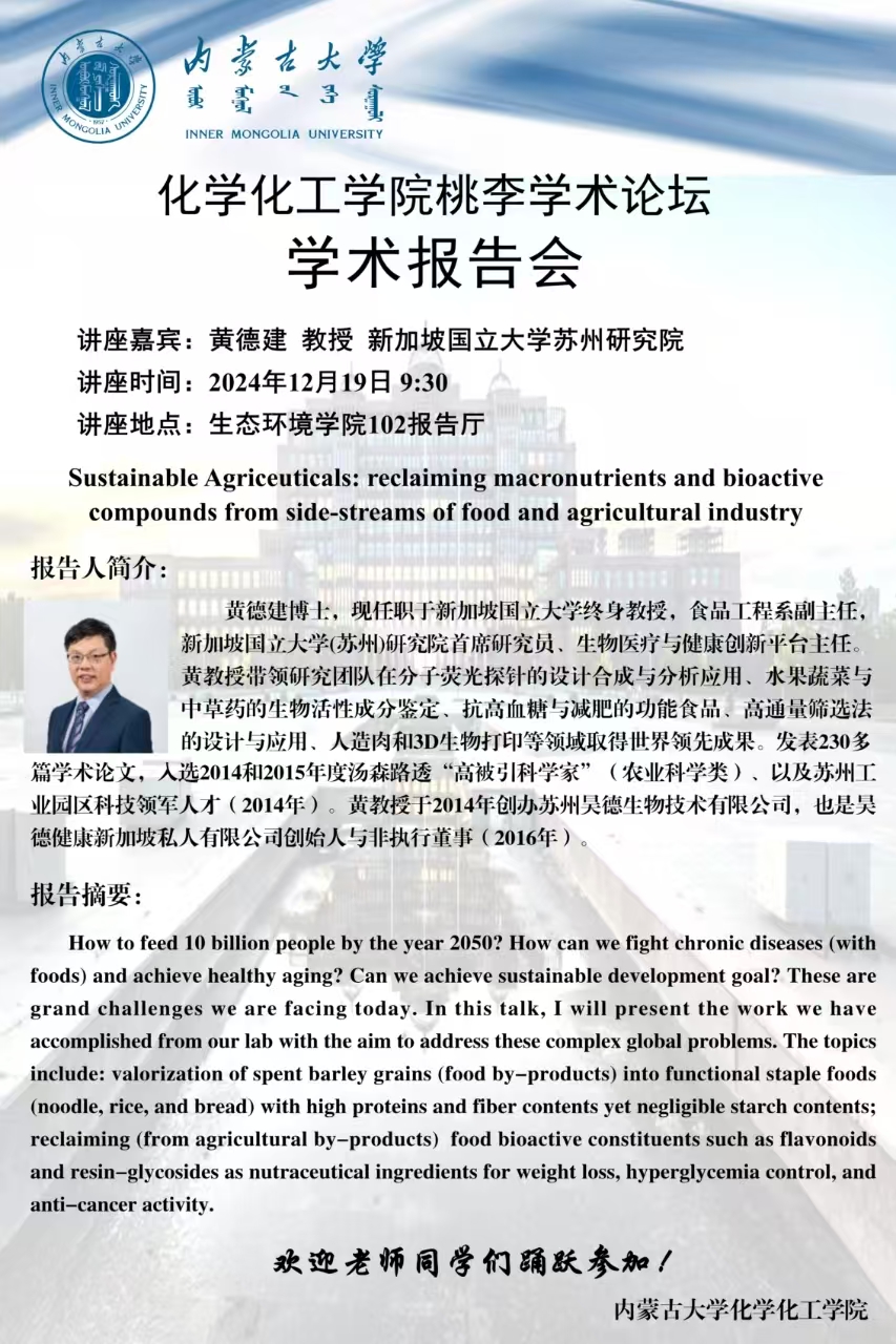 太阳集团tyc138桃李学术论坛——Sustainable Agriceuticals: reclaiming macronutrients and bioactive compounds from side-streams of food and agricultural industry 黄德建 教授 新加坡国立大学苏州研究院