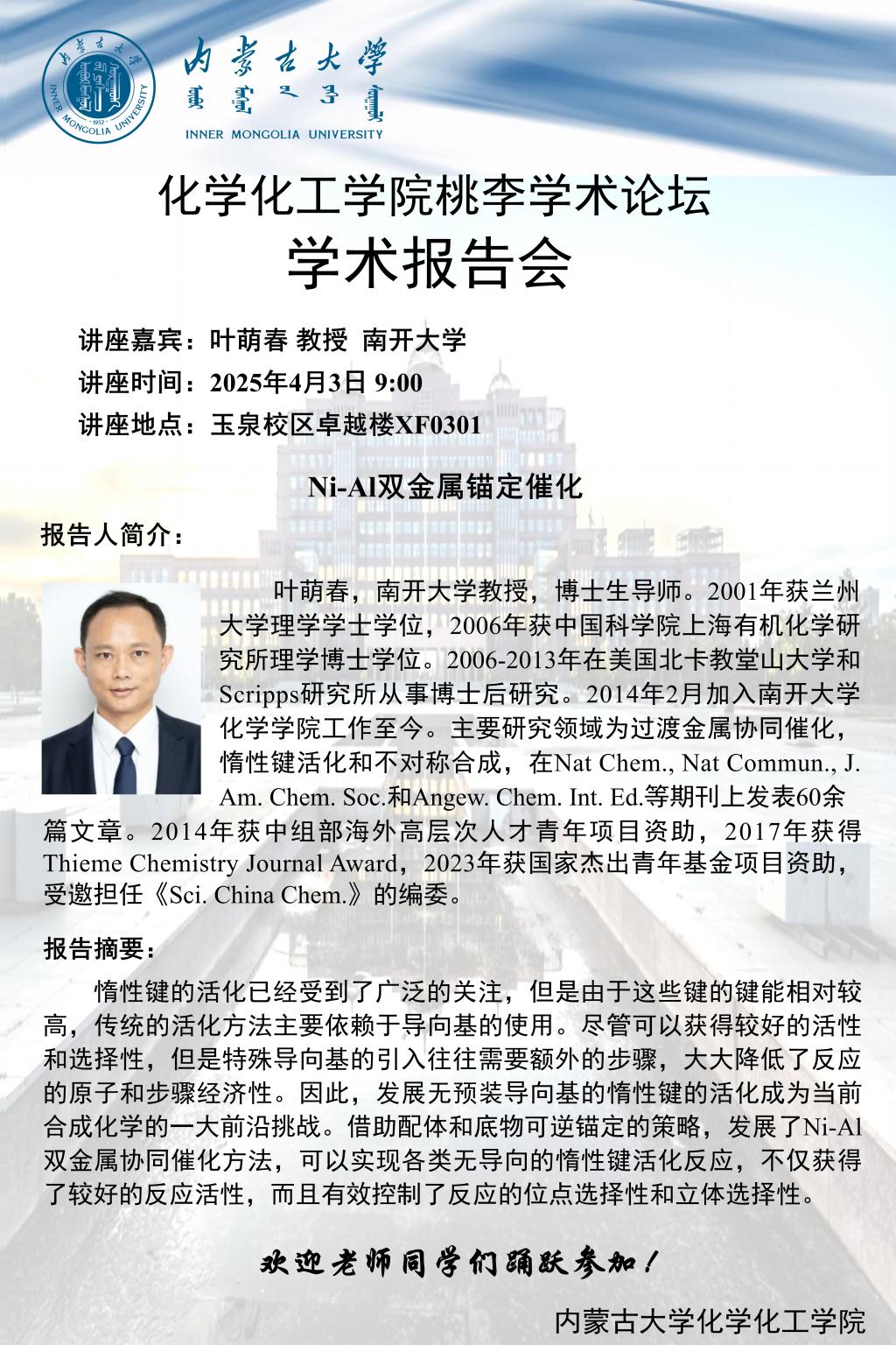 太阳集团tyc138桃李学术论坛——Ni-Al双金属锚定催化 叶萌春 教授 南开大学
