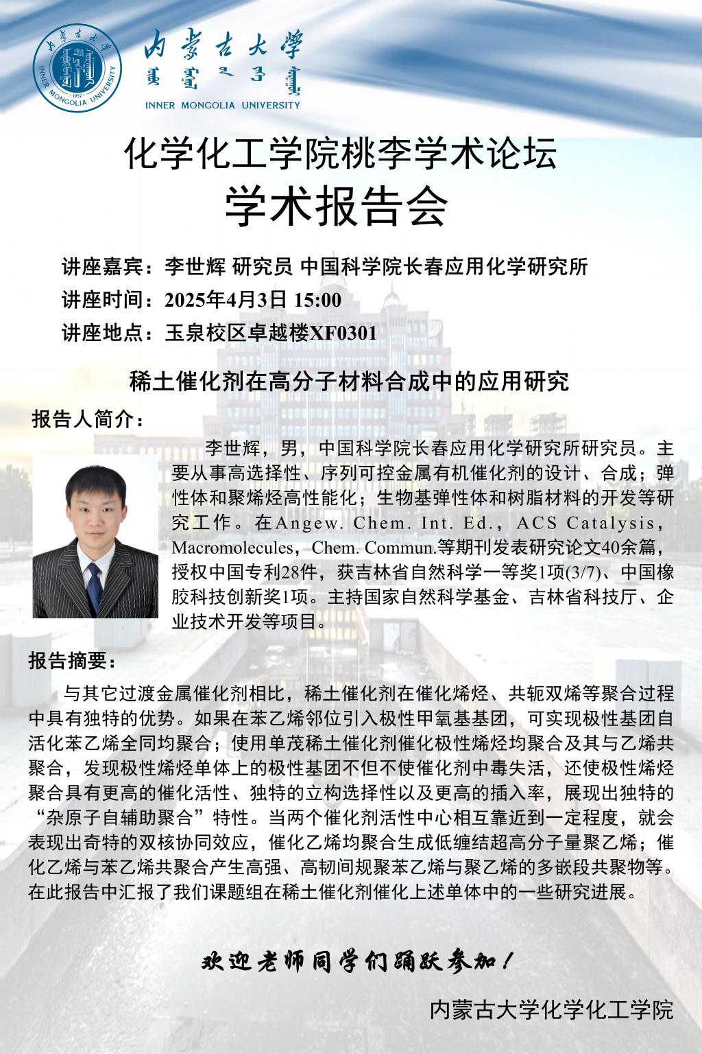 太阳集团tyc138桃李学术论坛——稀土催化剂在高分子材料合成中的应用研究 李世辉 研究员 中国科学院长春应用化学研究所