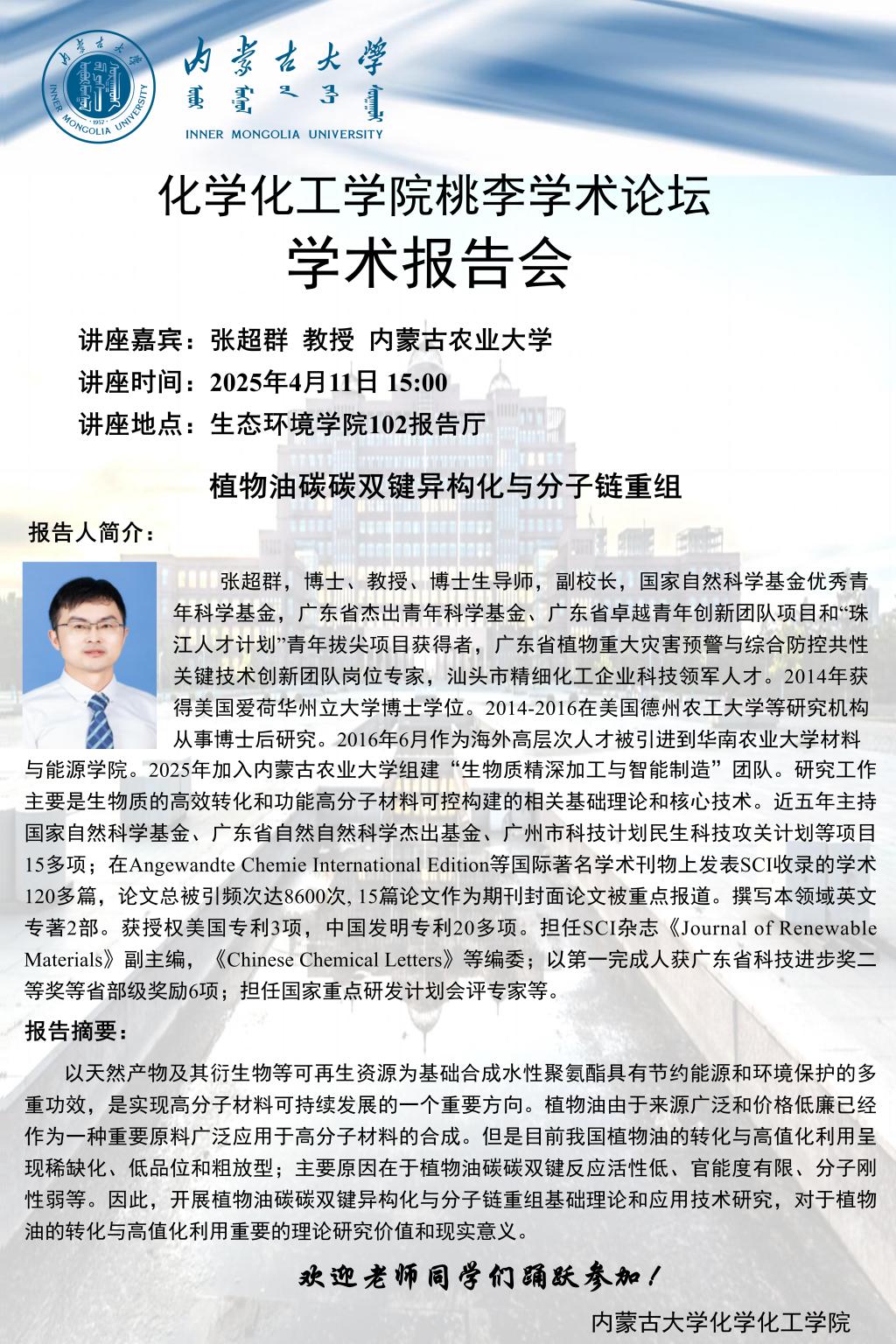 太阳集团tyc138桃李学术论坛——植物油碳碳双键异构化与分子链重组 张超群教授 内蒙古农业大学