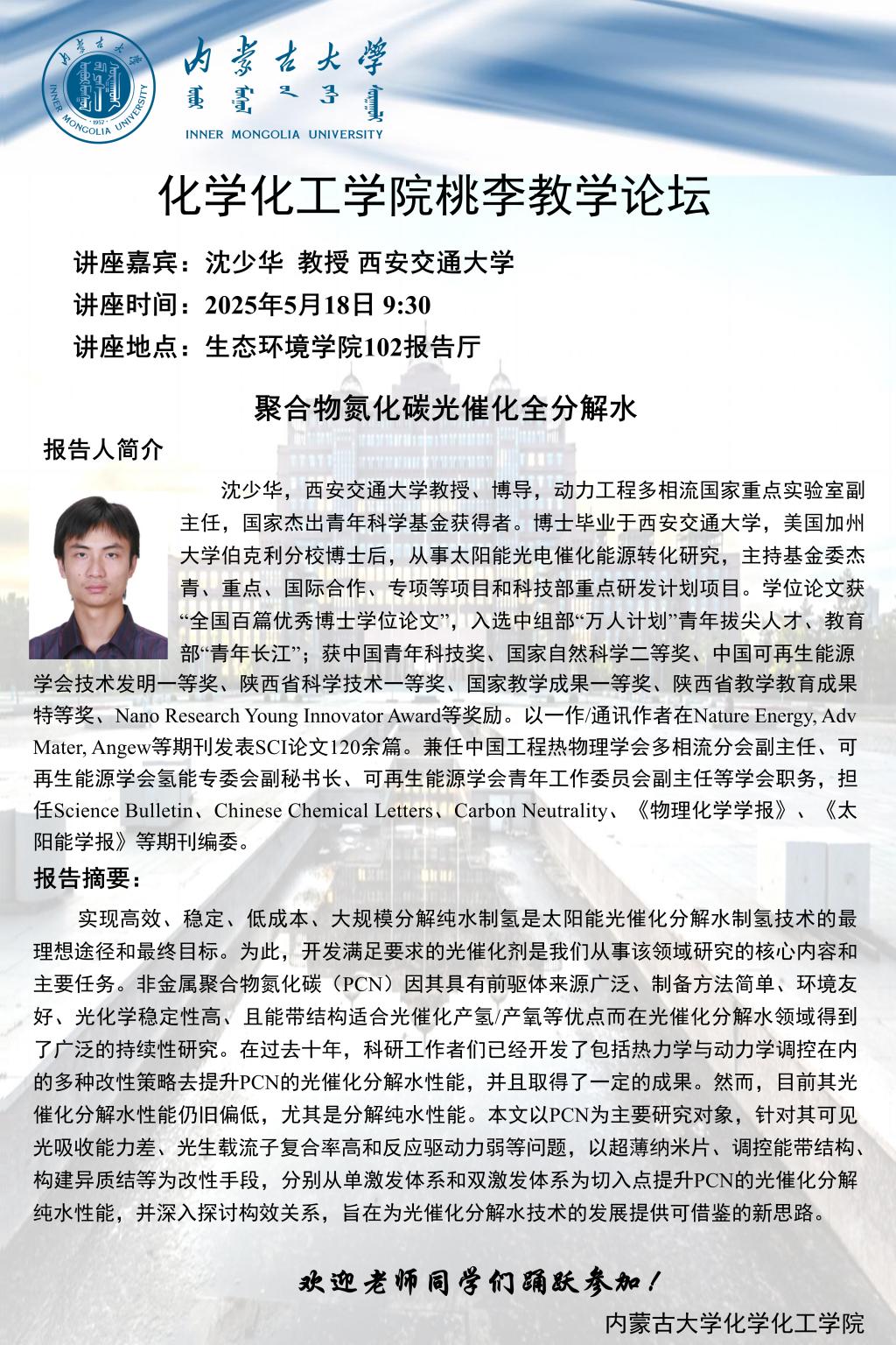 太阳集团tyc138桃李学术论坛——聚合物氮化碳光催化全分解水 沈少华 教授 西安交通大学