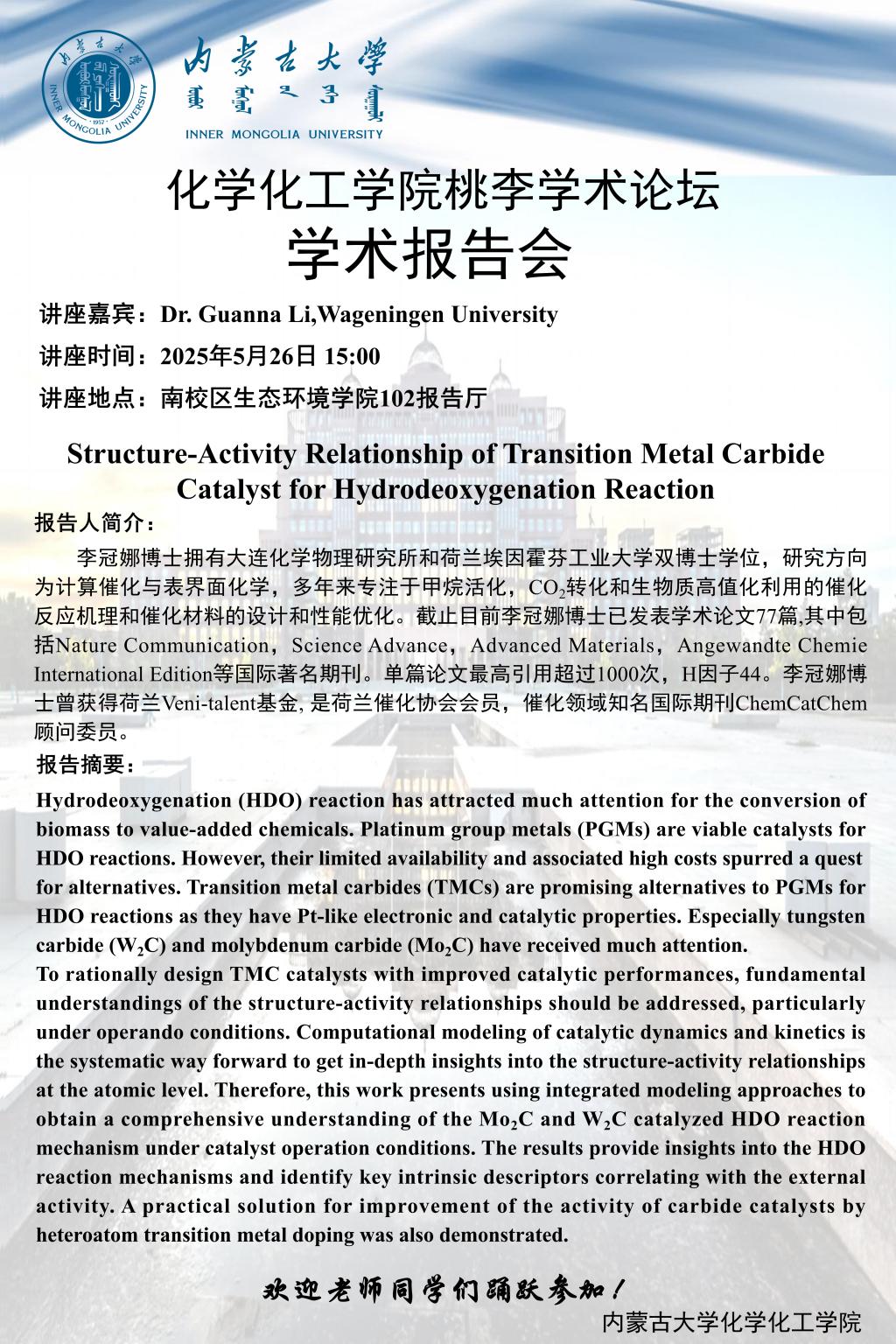 太阳集团tyc138桃李学术论坛——Structure-Activity Relationship of Transition Metal Carbide Catalyst for Hydrodeoxygenation Reaction