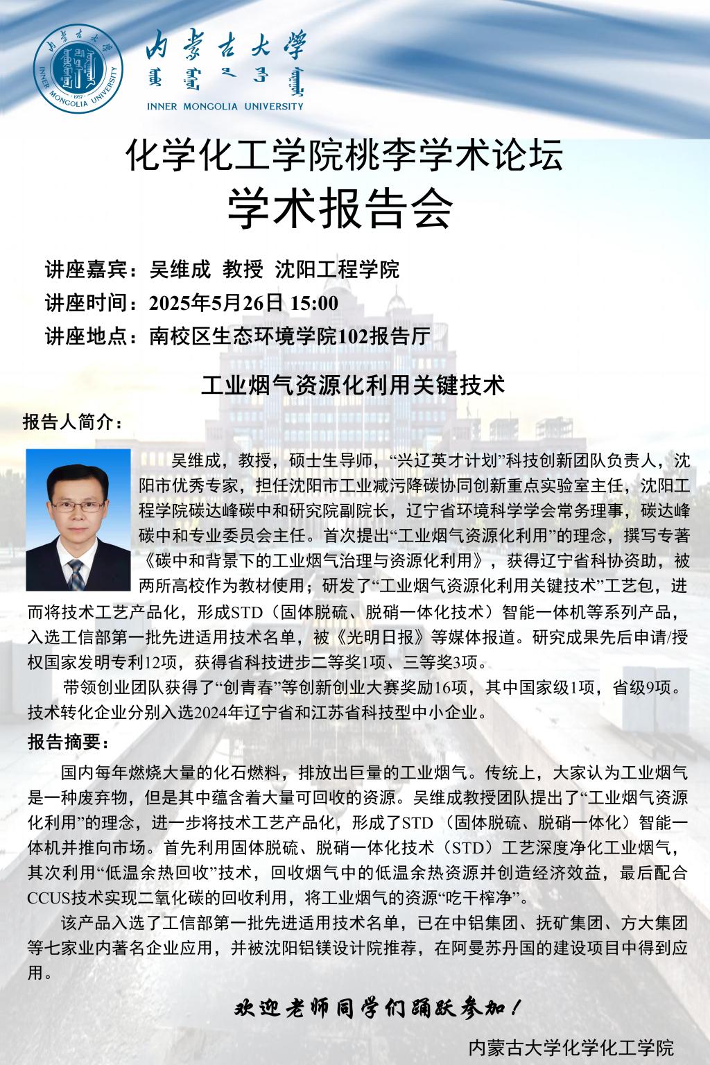 太阳集团tyc138桃李学术论坛——工业烟气资源化利用关键技术 吴维成 教授 沈阳工程学院