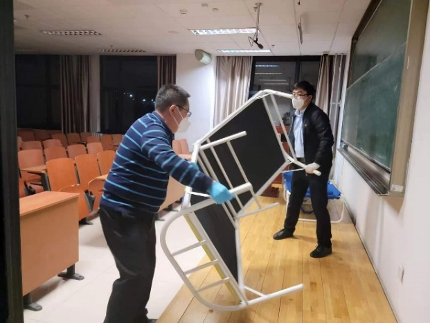 为了尽快解决学生转运所面临的住宿压力,学校紧急购买了一批折叠床以及床品物资。他们不顾自己长期奋战而导致的疲惫身体,扛着物资一趟又一趟地往返于楼下楼上进行搬运和安装。